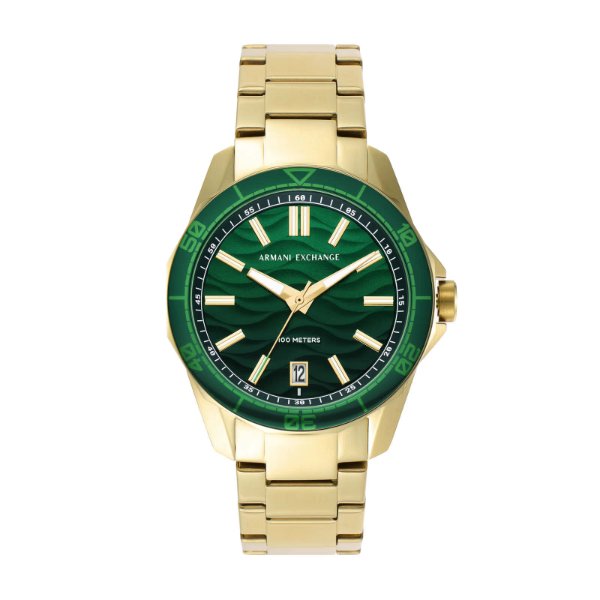 The Armani Exchange Spencer AX1951 men’s watch impresses with its elegant gold-green color scheme. The dial with a wave motif is complemented by a day-of-the-month date stamp. The whole is complemented by a green bezel. Water resistance is rated at 10 ATM.
