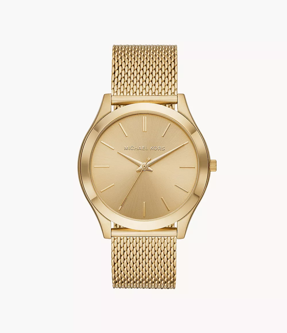 Featuring a classic silhouette, this gold-tone Michael Kors Slim Runway watch includes a gold-tone sunray dial with gold-tone stick indexes. A sleek mesh bracelet completes the look.