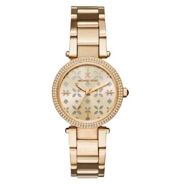 This is a Michael Kors Mini Parker Floral Cutout MK6469 gold-tone stainless steel ladies’ watch.